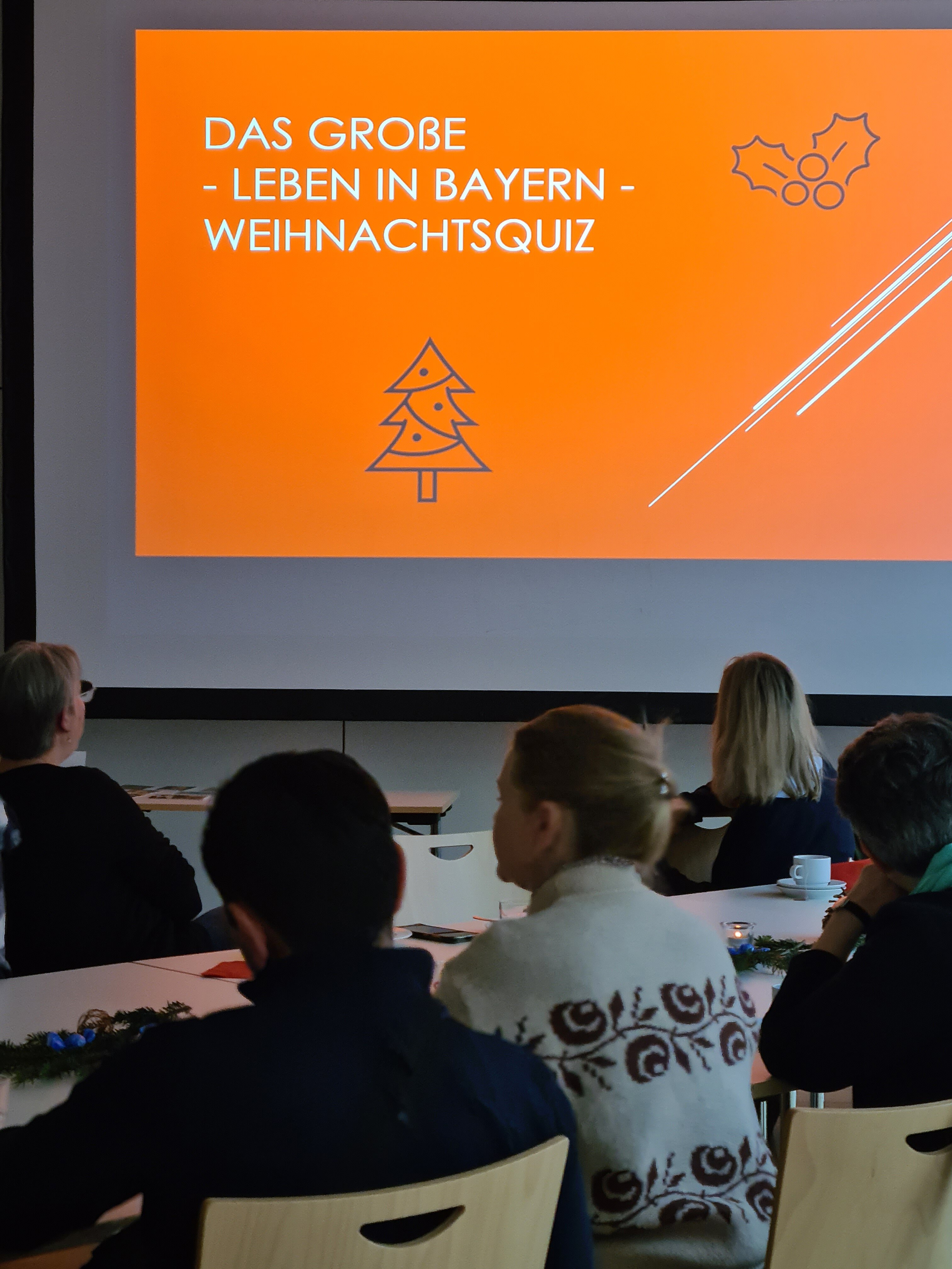 Das Winterfest war ein gelungener Jahresabschluss. Nachdem die Projektleiterin Dr. Sigrid Mahsberg alle Gäste begrüßt hatte, wurde bei Plätzchen und Früchtepunsch ein buntes Programm geboten. Marvin Grimm, Dozent im Modul „Bildung und Erziehung“, lud zum großen „Leben in Bayern – Weihnachtsquiz“ ein. Hier traten mehrere Gruppen mit viel Spaß gegeneinander an. Im Gespräch mit den Dozentinnen Maria Kim (Ernährungsberatung, Modul Gesundheit), Cornelia Wehrhahn und Elisabeth Fuchs (beide Modul „Miteinander leben“) wurden die Highlights der diesjährigen Maßnahme noch einmal aufgegriffen wie z.B. die Exkursionen in die Stadtbücherei und zu anderen Einrichtungen der Stadt, der Besuch des Röntgen-Museums oder das gemeinsame Kochen in der Lehrküche der Berufsfachschule für Diätassistent*innen.